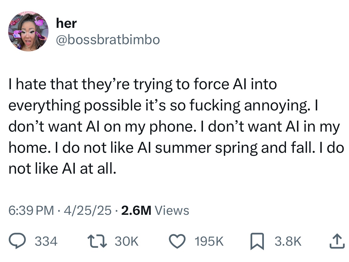 if even paid AI is losing money because people are using it too much you essentially have a product that becomes less profitable the more people use it. it seems counter intuitive from a business standpoint to push mass adoption of a technology that becomes less profitable the more it’s used.
